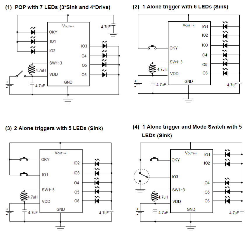 每個輸出腳都可分別設定為不同的電流。 (光罩選擇) 特殊功能選項 ”雜訊觸發” (Noise-Trigger)。