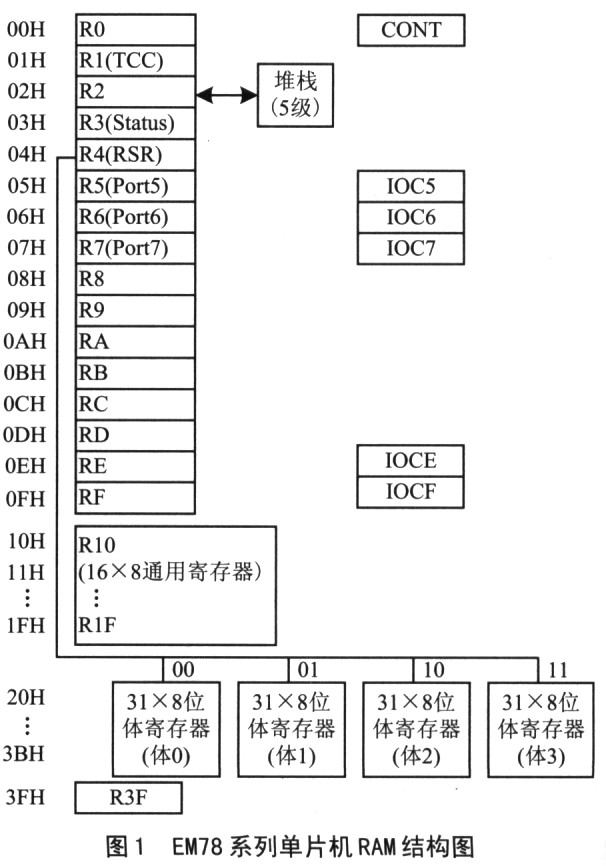 EM78系列的RAM既可以認為是普通單片機中的RAM,也可以認為是寄存器(通用和專用寄存器)。以EM78P447為例,RAM共148×8位,其結構如圖1所示。