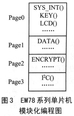 圖3中,PageO存放的主要是比較常用的子程序,如系統初始化程序、鍵盤掃描、液晶顯示等;Pagel存放的是一些數據處理程序,如不同Bank的數據拷貝,十六進制轉為二進制壓縮BCD碼等程序;Page2存放的加密算法程序,這是筆者項目開發中最重要的部分,所以單獨的放在一個Page內;Page3主要是對IC存儲器24LC02的一些讀寫操作子程序。這樣將功能相近的子程序放在一個Page內,從而根據單片機的結構特點結合項目開發的實際來劃分程序存儲空間。在這樣調試時,很容易發現問題出現在哪個區域,使得程序結構清晰明了,調用方便,易于調試和維護。