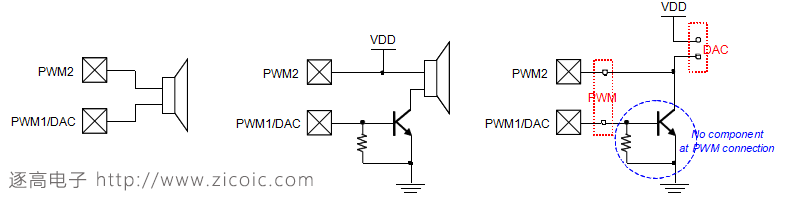 PWM/DAC 連接在一起 在使用 PWM 輸出時,我們針對不同的客戶需求提供普通 PWM 電流或大 PWM 電流的選擇。 大 PWM 消耗更多電流,使聲音更響亮。