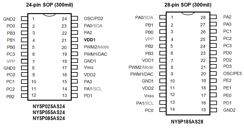 對于 NY5P025A ~ NY5P085A 主體,PD2 焊盤與外部 OSC 焊盤共用。當用戶啟用外部 OSC 功能時,PD2 功能將被禁用。對于 NY5P185A ~ NY5P345A 主體,PE3 焊盤與外部 OSC 焊盤共用。當用戶啟用外部 OSC 功能時,PE3 功能將被禁用。對于 NY5P520A ~ NY5P720A 機身,PF3 焊盤與外部 OSC 焊盤共用。當用戶啟用外部 OSC 功能時,PF3 功能將被禁用。
