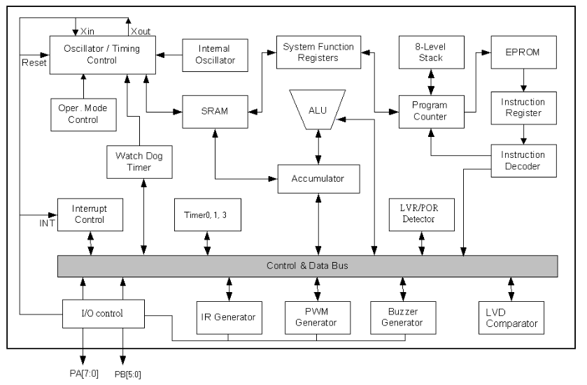 14 根可分別單獨(dú)控制輸入輸出方向的I/O腳(GPIO)、PA[7:0]、PB[5:0]。