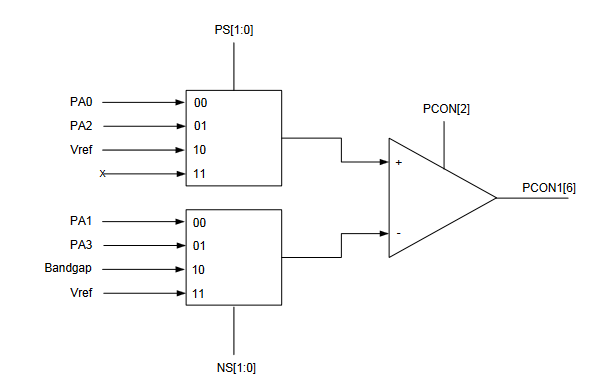 CMPEN(寄存器 PCON[2])用于啟用和禁用比較器。 當(dāng) CMPEN=0(默認(rèn))時(shí),比較器為