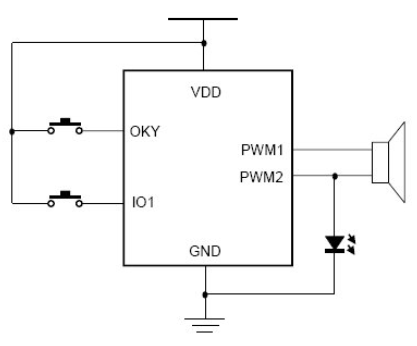 一組PWM輸出,有兩種PWM音量可供選擇(正常音量&大音量),可直接驅動8Ω、16Ω、32Ω、64Ω的喇叭或蜂鳴片。