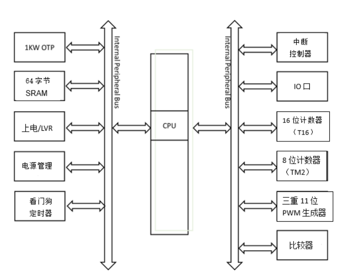 PML100 內(nèi)置 1KW OTP 程序存儲(chǔ)器以及 64 字節(jié)數(shù)據(jù)存儲(chǔ)器,內(nèi)置一個(gè)硬件比較器用于比較兩個(gè)管腳之間或