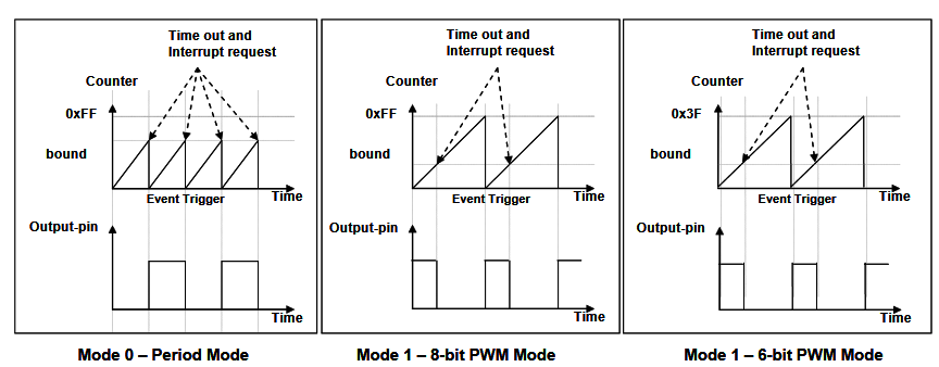 PWM 占空比。8 位 PWM 定時器有兩個工作模式:周期模式和 PWM 模式;周期模式用于輸出固定周期波形或中