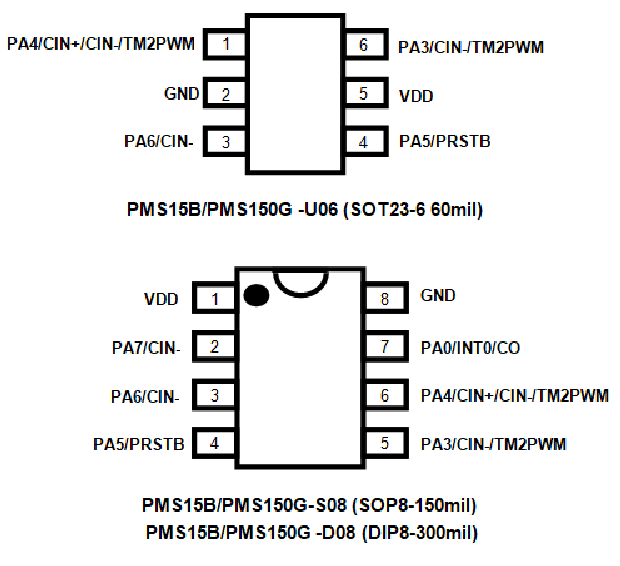 PMS15B/PMS150G 的燒錄腳為 PA3,PA4,PA5,PA6,VDD,GND 這 6 只引腳。