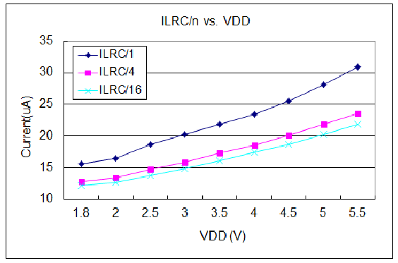 工作電流與 VDD、系統時鐘 CLK=ILRC/n 曲線圖