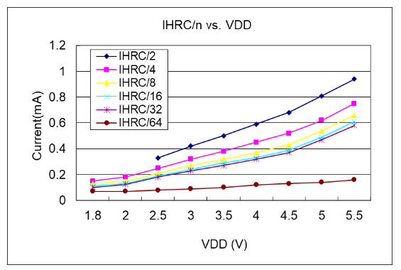 工作電流與 VDD、系統時鐘 CLK=IHRC/n 曲線圖