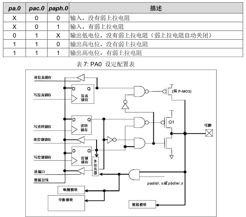 據寄存器的值。表 7 為端口 PA0 位的設定配置表。圖.18 顯示了 IO 緩沖區硬件圖。