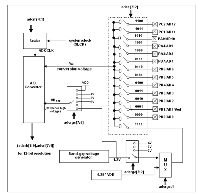 ADC 參考高電壓:外部輸入,內部 VDD,Band-gap 1.20V,4V,3V 及 2V