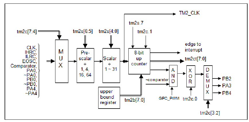 8 位 PWM 定時器只能執行 8 位上升計數操作,經由寄存器 tm2ct,定時器的值可以設置或讀取。當 8 位定