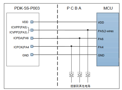 燒錄需要使用 PDK5S-P-003 上五根引線:ICPCK(PA4)、ICPDA(PA6)、VDD、GND、ICVPP(PA5)、