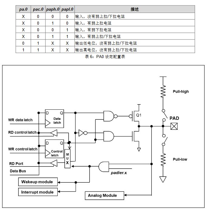 端口的值。舉例,表 6 為端口 PA0 位的設定配置表