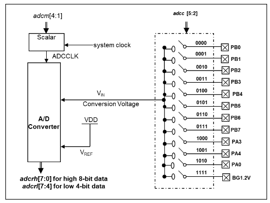 (3) 通過 adcc 寄存器選擇 ADC 輸入通道