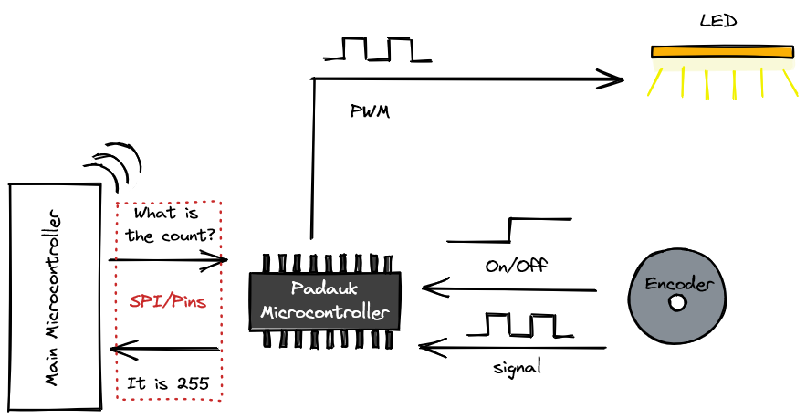 這個(gè)概念非常簡(jiǎn)單:使用 Padauk 微控制器完成讀取編碼器的繁瑣工作,然后為另一個(gè)微控制器提供訪問(wèn)計(jì)數(shù)的簡(jiǎn)單方法。