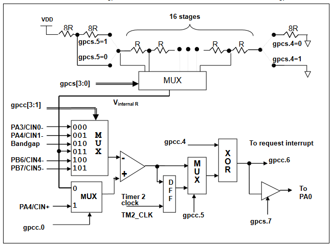 gpcc 的[3:1]位來選擇。比較器的正輸入可以是 PA4 或者 Vinternal R,并由 gpcc 寄存器的位 0 來選擇。