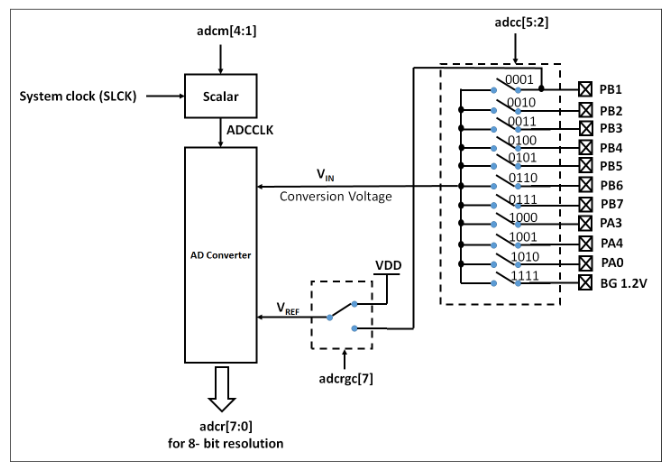 (4) 通過 adcc 寄存器選擇 ADC 輸入通道