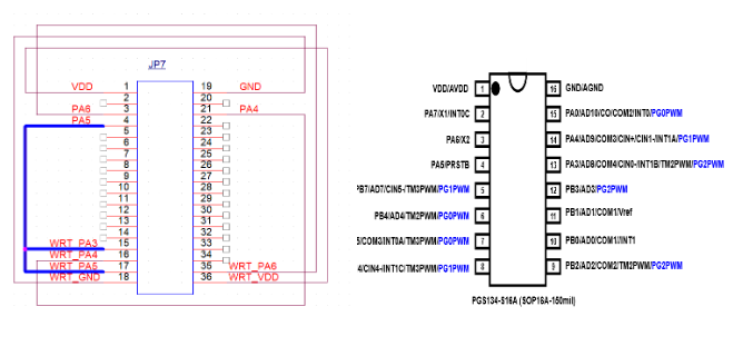 例如,PGS134-SOP16A 在燒錄器上的 JP7 跳線信號(hào)連接圖,如下所示: