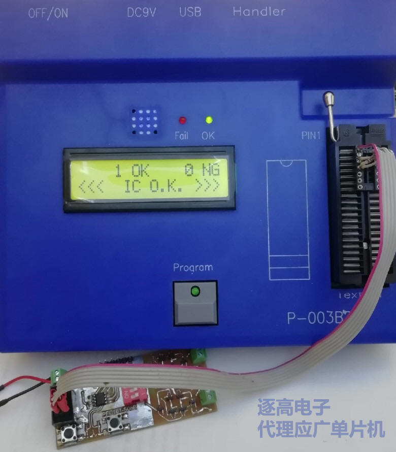 在 Padauk PDK5S-P-003 編程器底部的蓋子下,確保除 JP2 外沒有安裝任何跳線。JP2 的所有八個位置都應安裝跳線。這意味著編程器的配置使得標準 16 針 MCU 封裝安裝在 ZIF 插座的頂部。