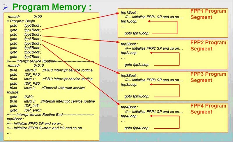 基本上應(yīng)廣科技(Padauk )的FPPA, inside 了8 顆RISC type 1T 的MCU, 除了每顆MCU 有自己的Flag ,PC counter, Stack pointer, Accumulator 外,其余的ROM,RAM,IO 等是共用的.故每一MCU 都可隨時(shí)監(jiān)控其他MCU 的狀況.(MCU#0 還多了16bit 的timer & 中斷管理可處理I/O中斷和內(nèi)部中斷).