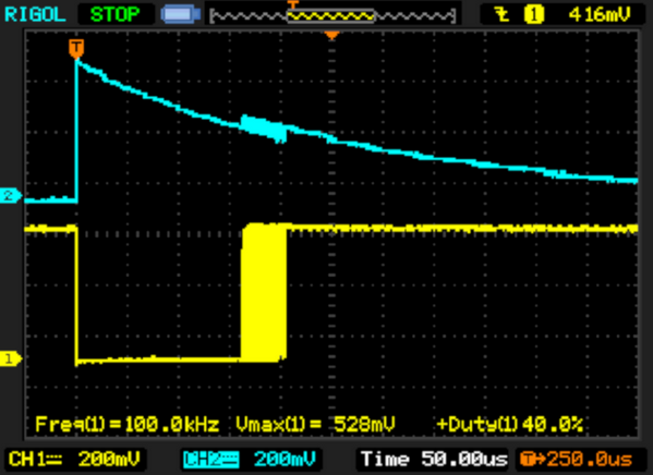 上面的示波器圖像顯示了 LED (ch2) 和比較器輸出 (ch1) 兩端的電壓??梢郧宄乜吹?,在初始充電后,LED 上的電壓消散,比較器在參考電平(本例中約為 2.5V)處切換。不幸的是,這已經顯示出一些問題:從比較器輸出到 LED 引腳存在顯著的串擾,并且還存在大量噪聲。比較器不會在精確的電壓下切換,但會引入顯著的時序 ji