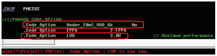 心將 LVR 選得太低,IDE 會(huì)去檢查 SYSCLK 和 LVR 的關(guān)系。用戶也可以通過在程序中寫