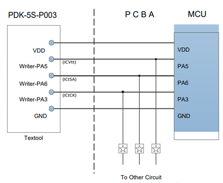 為實(shí)驗(yàn)開(kāi)發(fā)了調(diào)試費(fèi)。微控制器PFC161的文檔說(shuō),微控制器支持架構(gòu)內(nèi)編程模式。為此,使用了五條程序員線:ICPCK、LASPA、VDD、GND和ICVPP。它們分別連接到微控制器的引腳:PA3、PA6、VDD、GND 和 PA5。